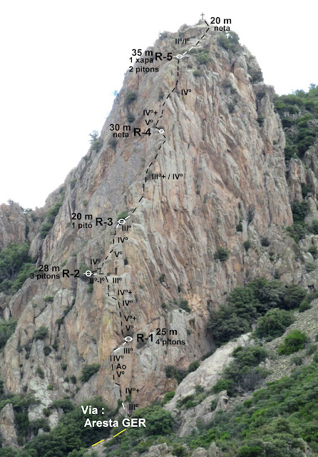 Quart llarg : Se surt per la dreta a trobar l'aresta i recte amunt amb una escalada de blocs que cada un d'ells és un petit ressalt, molt maca i de grau amable, al cap de munt anem un xic a l'esquerra a on una grossa sabina ens dona l'opció de fer una reunió prou còmoda. 30 metres, neta, IIIº+ - IVº.